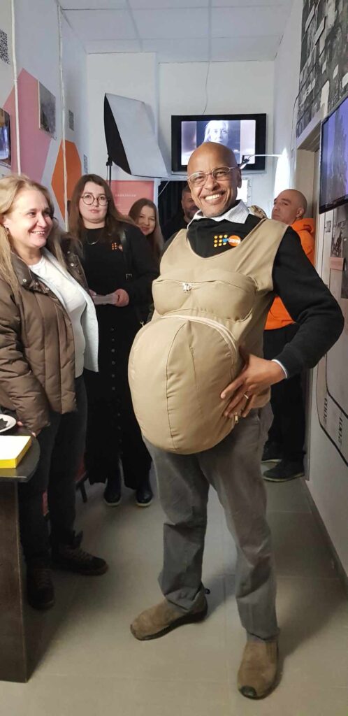 Мустафа Ельканзі – Старший координатор із надзвичайних ситуацій/Заступник представника UNFPA в Україні –  наголосив, що важливо залучати молодих жінок до демократичних перетворень та переговорних процесів з миробудування та відновлення. Пан Ельканзі також розповів про досвід і вплив жіночого руху в Судані. Враховуючи інтерактивність Музею, а саме його експонатів, пан Мустафа Ельканзі під час екскурсії приміряв на себе експонат «Вагітність», який щоразу дає можливість відчути водночас важливий і важкий стан вагітної жінки.