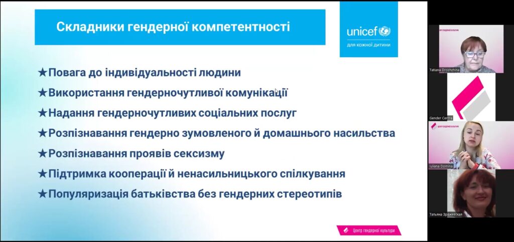 Починаючи з лютого протягом чотирьох місяців тренерки Центру гендерної культури провели 23 вебінари з гендерної компетентності для персоналу первинної ланки, які надають послуги дітям. Серед них: